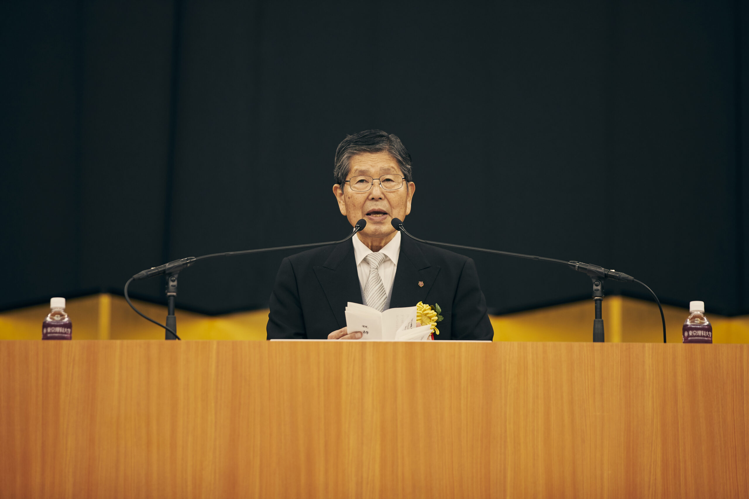 学位記、修了証書授与や、大村賞などの授与が厳かに執り行われた後、石川学長による式辞、浜本理事長祝辞に続き、増渕理窓会会長からも卒業生や修了生に向けて祝辞が述べられました。