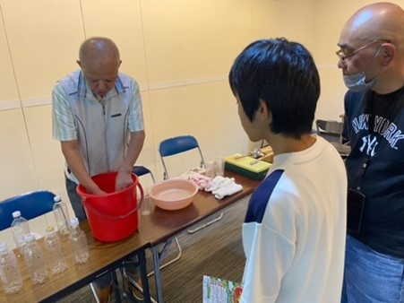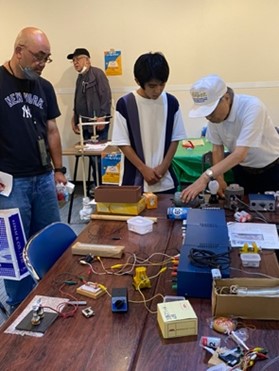 【指導者; 渡辺聰明先生(電磁気)、坂本公機先生(三振り子)、工藤眞紀夫先生(水の圧力)、藤原広洋先生(全体サポート)、村本卓・青森支部長(八戸学院大学・学長補佐教授)の5人が指導されました。】