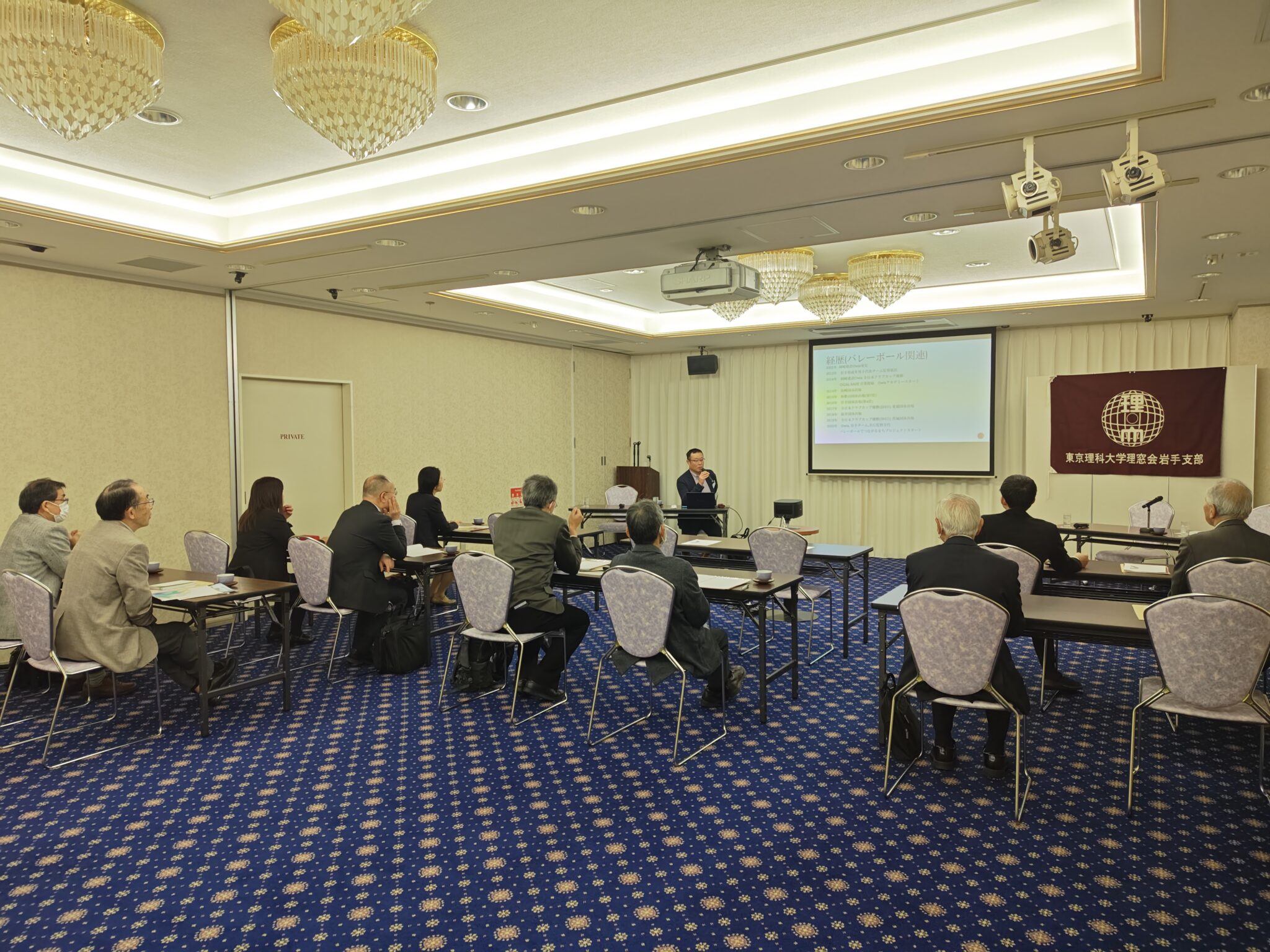今年の情報交換会は、支部会員の岡崎希裕さんに「バレーボールでまちを元気に」というタイトルで講演いただきました。「若者が町への誇りと愛着を持てるまちづくり」を目指す、紫波町、企業、町民が一体となった活動を紹介していただきました。支部総会では令和6年度会計報告の承認をいただいた後、今後の支部会活動について意見交換が行われました。遠方に住む会員や若い会員への支部総会参加費支援等について、今後役員会で継続検討していくことになりました。その後は浜本大学理事長と石川学長のビデオメッセージを放映した後、理窓会本部の活動状況を野村副会長からご説明いただきました。今年度初の試みとして実施したブロック会議や野田キャンパスで同時開催されたホームカミングデー、他支部の活動等についてご報告いただきました。