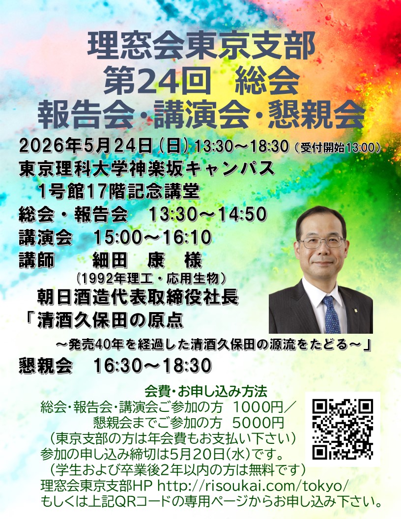 来る5月24日(日)に、東京支部総会を開催いたします。総会では、2025年度の活動報告・収支決算と2026年度の活動計画・収支予算について皆様からの忌憚のないご意見を伺いたいと存じます。理事長による大学の現状、維持会会長・理窓会会長からのお話の後のご講演は、朝日酒造株式会社社長の細田康様による「清酒久保田の原点~発売40年を経過した清酒久保田の源流をたどる~」となりました。